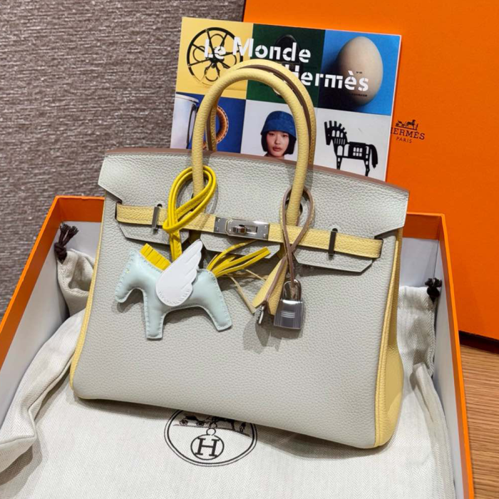 최고퀄 에르메스 올수공 버킨 25 Gris Perle & Jaune Poussin 토고 가죽 은장 > 여성 가방